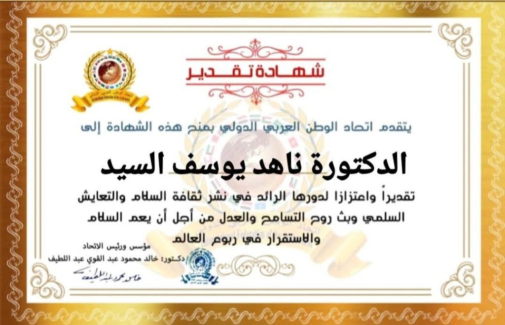 مؤسس ورئيس اتحاد الوطن العربي الدولي يمنح شهادة تقديرللدكتورة ناهد يوسف عبده السيد رئيس الهيئة العامة للتنمية الصناعيةitihadworld26/12/2025تكريمات