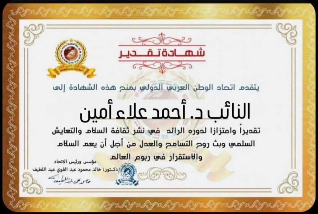 مؤسس ورئيس اتحاد الوطن العربي الدولي يمنح شهادة تقدير للنائب الدكتور أحمد علاء أمين مساعد الشباب بحزب مستقبل وطن وعضو مجلس النوابitihadworld30/01/2026تكريمات