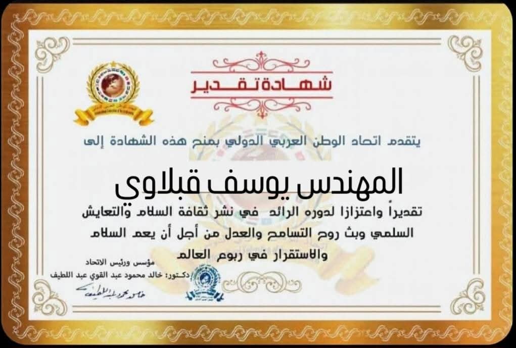 مؤسس ورئيس اتحاد الوطن العربي الدولي يمنح شهادة تقدير للمهندس يوسف قبلاوي الرئيس التنفيذي للشركة السورية للبترولitihadworld31/01/2026تكريمات
