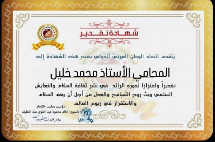 مؤسس ورئيس اتحاد الوطن العربي الدولي يمنح شهادة تقدير للمحامي الأستاذ محمد خليل نقيب محامين غرب طنطا