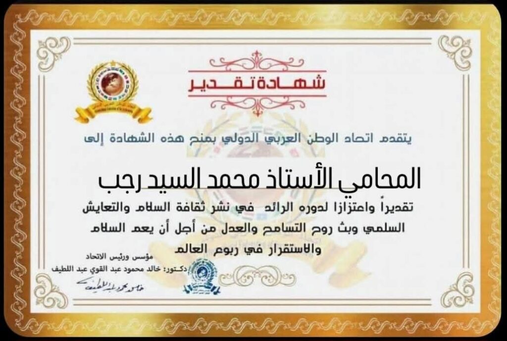مؤسس ورئيس اتحاد الوطن العربي الدولي يمنح شهادة تقدير للمحامي الأستاذ محمد السيد رجب نقيبا للمحامين عن دائرة أول طنطا من محافظة الغربية بجمهورية مصر العربيةitihadworld01/02/2026تكريمات