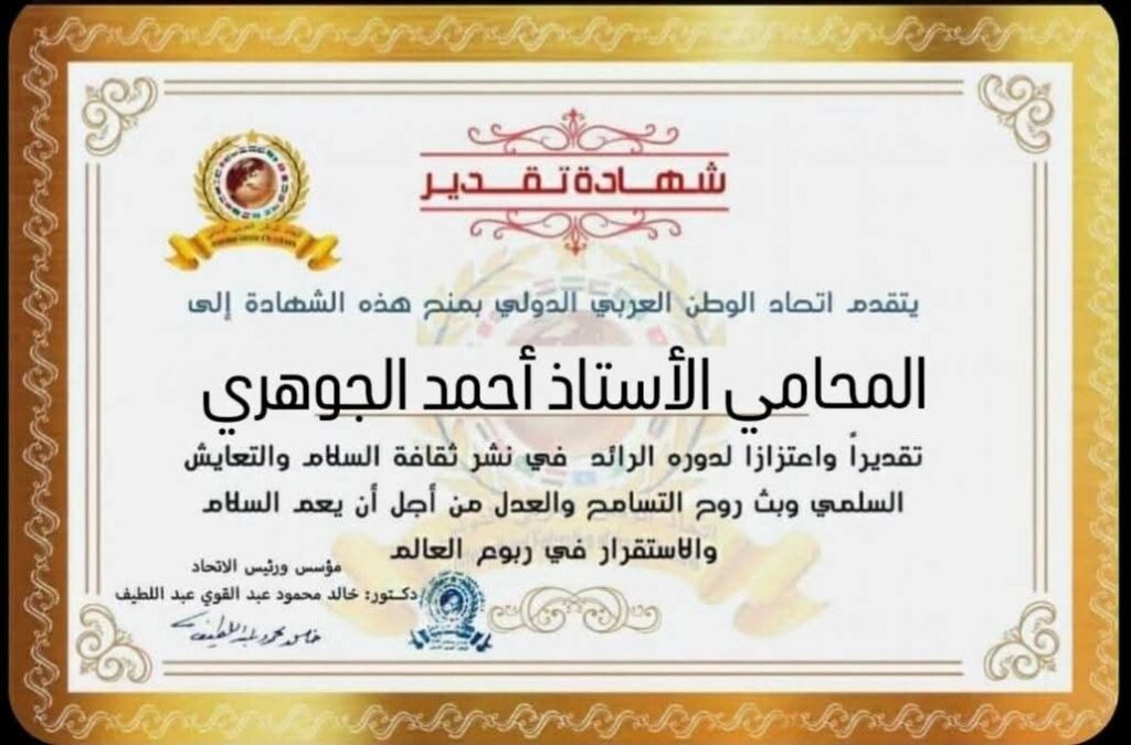 مؤسس ورئيس اتحاد الوطن العربي الدولي يمنح شهادة تقدير للمحامي الأستاذ أحمد الجوهري نقيبا للمحامين عن دائرة كفر الزيات من محافظة الغربية بجمهورية مصر العربيةitihadworld01/02/2026تكريمات