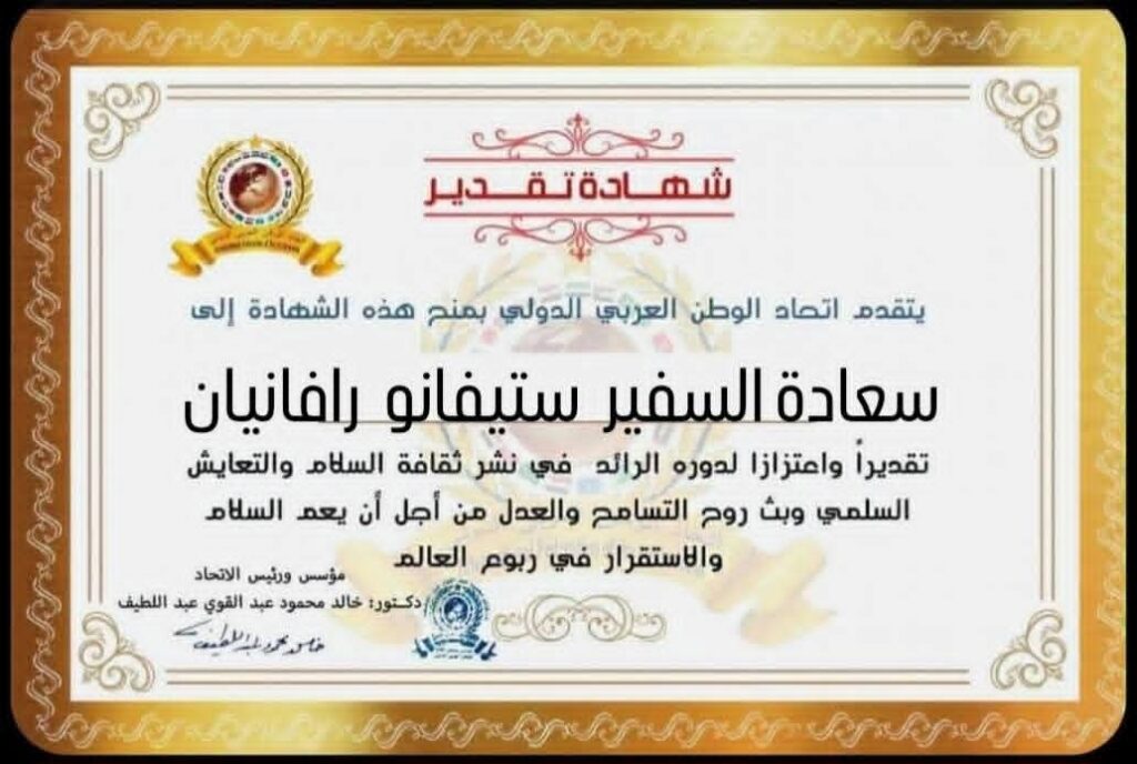 مؤسس ورئيس اتحاد الوطن العربي الدولي يمنح شهادة تقدير لسعادة السفير ستيفانو رافانيان سفير إيطاليا في سورياitihadworld01/02/2026تكريمات
