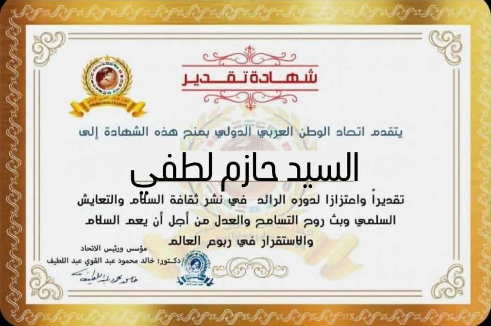 مؤسس ورئيس اتحاد الوطن العربي الدولي يمنح شهادة تقدير للسيد حازم لطفي رئيس هيئة الإستثمار في محافظة حلبitihadworld01/02/2026تكريمات