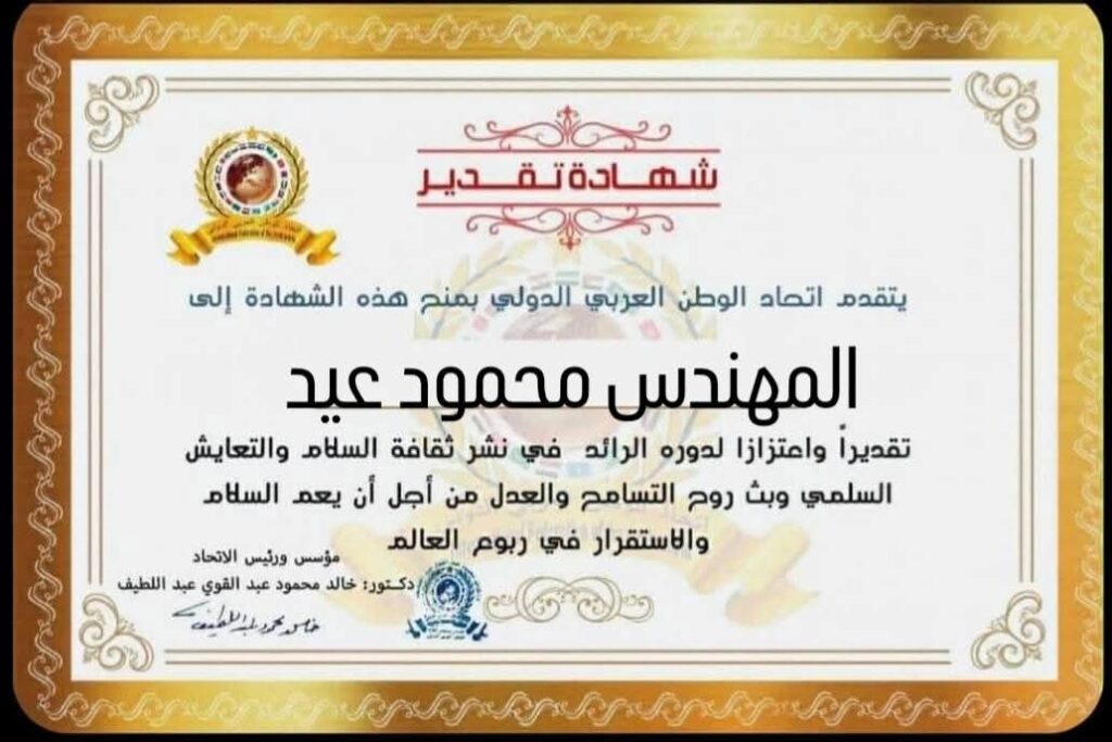 مؤسس ورئيس اتحاد الوطن العربي الدولي يمنح شهادة تقدير للمهندس محمود عيد رئيس نادي بيراميدزitihadworld02/02/2026تكريمات