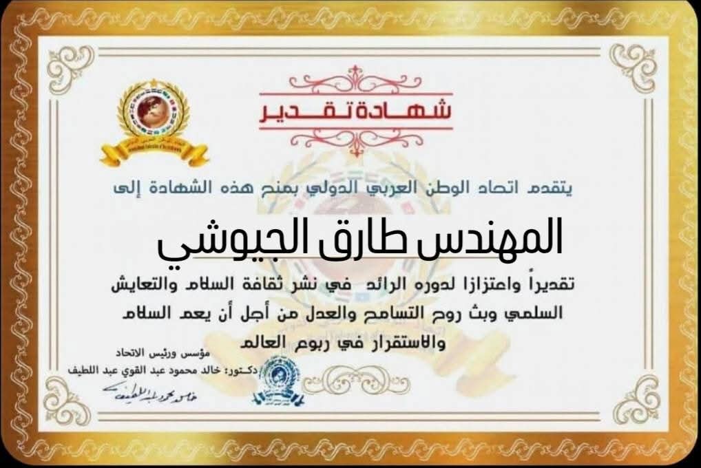 مؤسس ورئيس اتحاد الوطن العربي الدولي يمنح شهادة تقدير للمهندس طارق الجيوشي رئيس مجلس إدارة مجموعة الجيوشي للحديد والصلب من جمهورية مصر العربيةitihadworld02/02/2026تكريمات