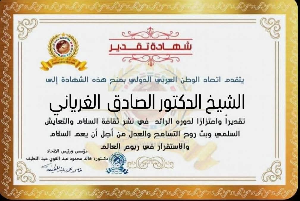 مؤسس ورئيس اتحاد الوطن العربي الدولي يمنح شهادة تقدير للشيخ الدكتور الصادق الغرياني مفتي عام ليبياitihadworld03/02/2026تكريمات