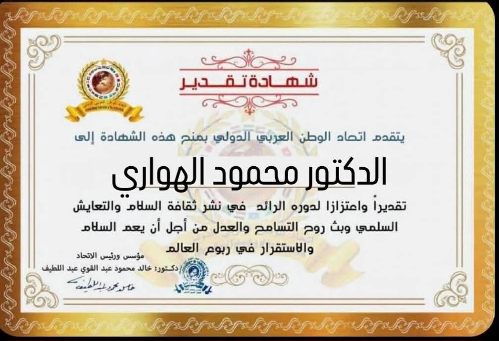 مؤسس ورئيس اتحاد الوطن العربي الدولي يمنح شهادة تقدير للدكتور محمود الهواري الأمين العام المساعد بمجمع البحوث الإسلامية بجمهورية مصر العربيةitihadworld03/02/2026تكريمات
