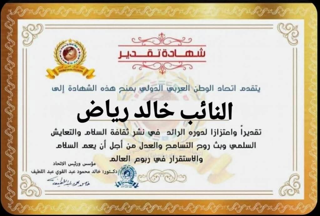 مؤسس ورئيس اتحاد الوطن العربي الدولي يمنح شهادة تقدير للنائب خالد رياض عبد الجواد عبد المقصود عضو مجلس النواب عن محافظة القاهرة الدائرة التاسعة عشرitihadworld26/12/2025تكريمات