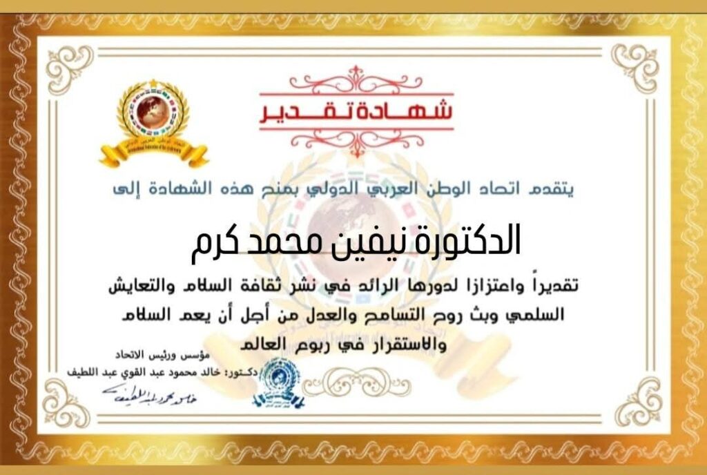 مؤسس ورئيس اتحاد الوطن العربي الدولي يمنح شهادة تقدير للدكتورة نيفين محمد كرم مدير إدارة التعليم المستمر وبرامج خدمة المجتمع فرع القاهرة