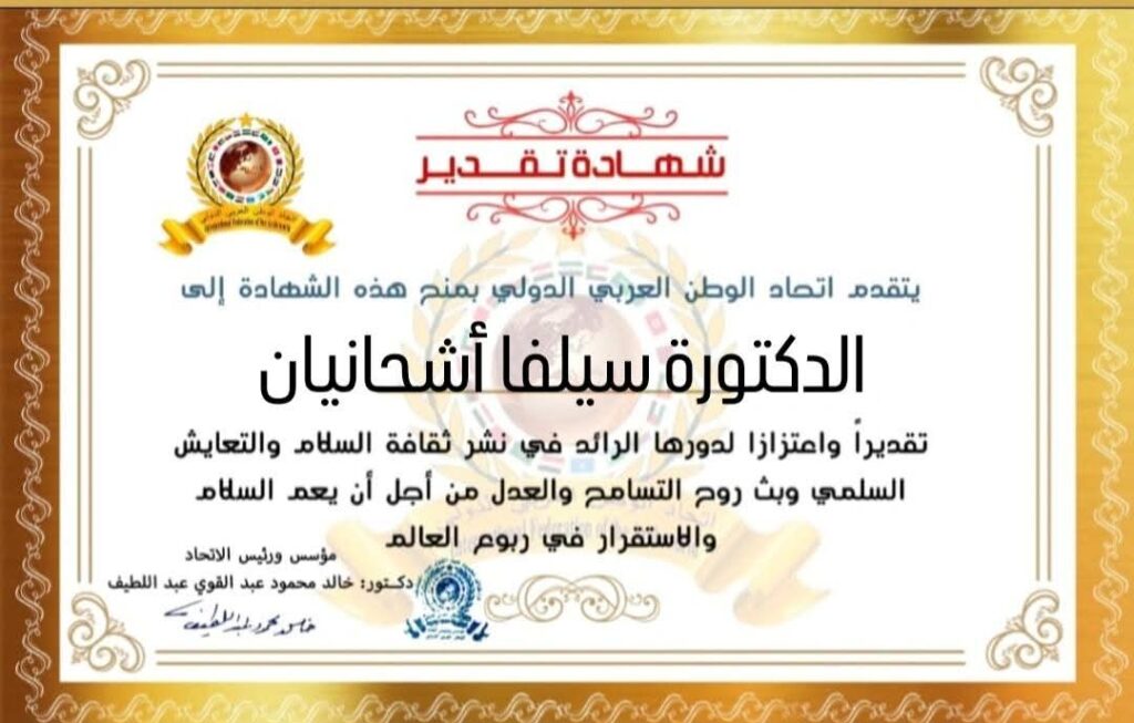مؤسس ورئيس اتحاد الوطن العربي الدولي يمنح شهادة تقدير للدكتورة سيلفا اشحانيان عميد كلية الطب البشري لجامعة حلب