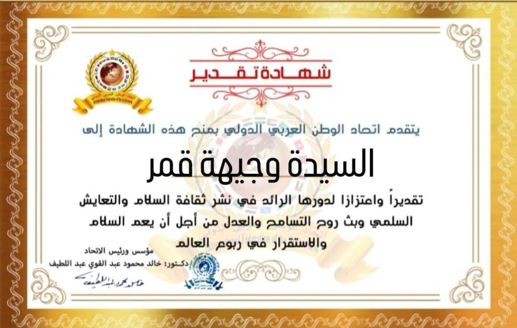 مؤسس ورئيس اتحاد الوطن العربي الدولي يمنح شهادة تقدير للسيدة وجيهة قمر وزيرة الدولة لشؤون التعليم الاتحادي والتدريب المهني من جمهورية باكستان الإسلاميةitihadworld04/02/2026تكريمات