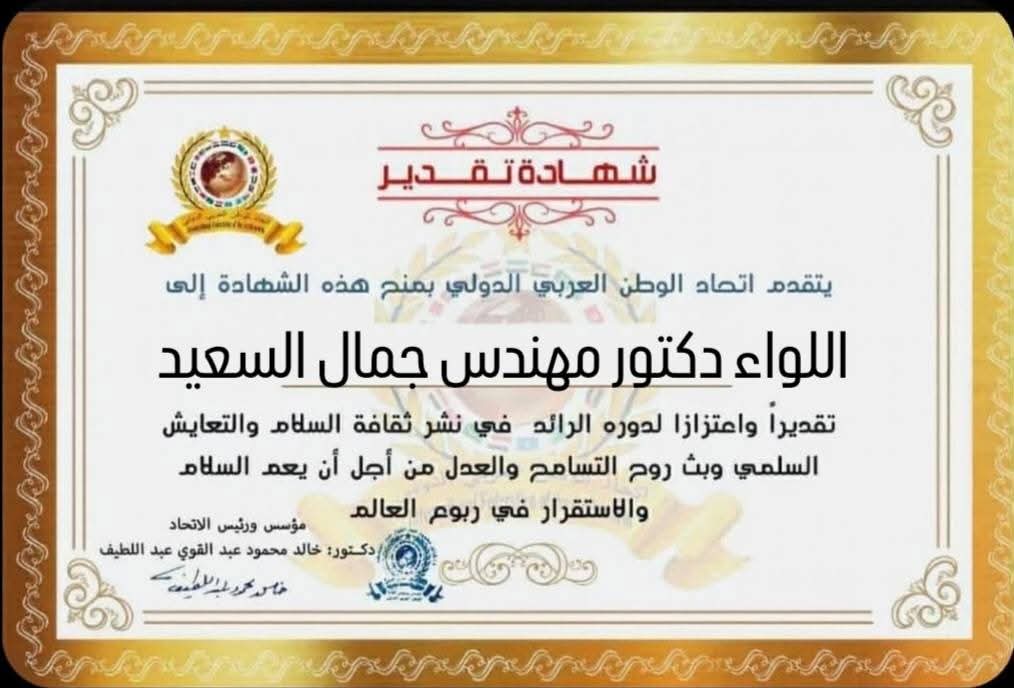 مؤسس ورئيس اتحاد الوطن العربي الدولي يمنح شهادة تقدير للواء دكتور مهندس جمال السعيد رئيس لجنة السيارات بجهاز حماية المستهلك بجمهورية مصر العربيةitihadworld04/02/2026تكريمات