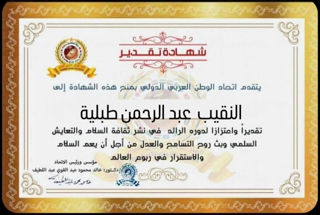 مؤسس ورئيس اتحاد الوطن العربي الدولي يمنح شهادة تقدير للنقيب عبد الرحمن طبلية بمركز شرطة كفر الزيات مديرية أمن الغربية بوزارة الداخليةitihadworld05/02/2026تكريمات