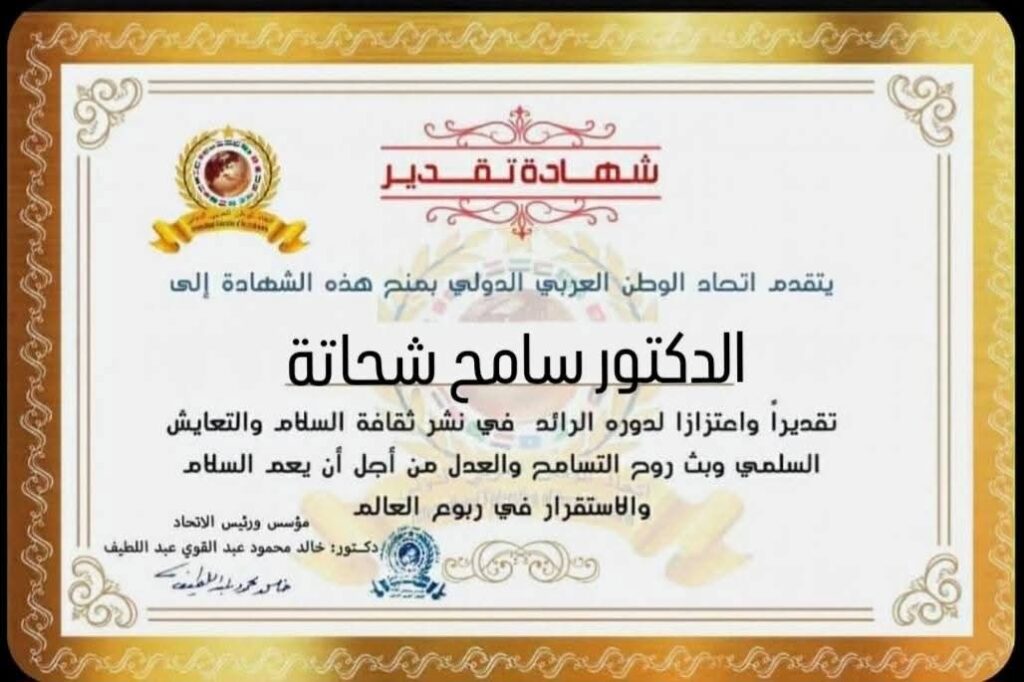 مؤسس ورئيس اتحاد الوطن العربي الدولي يمنح شهادة تقدير للدكتور سامح شحاتة مستشار مكتب العلاقات الدولية بجامعة الإسكندريةitihadworld05/02/2026تكريمات