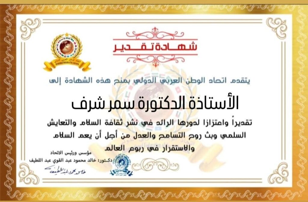 مؤسس ورئيس اتحاد الوطن العربي الدولي يمنح شهادة تقدير للأستاذة الدكتورة سمر شرف عميد معهد بحوث الصناعات النسيجيةitihadworld05/02/2026تكريمات
