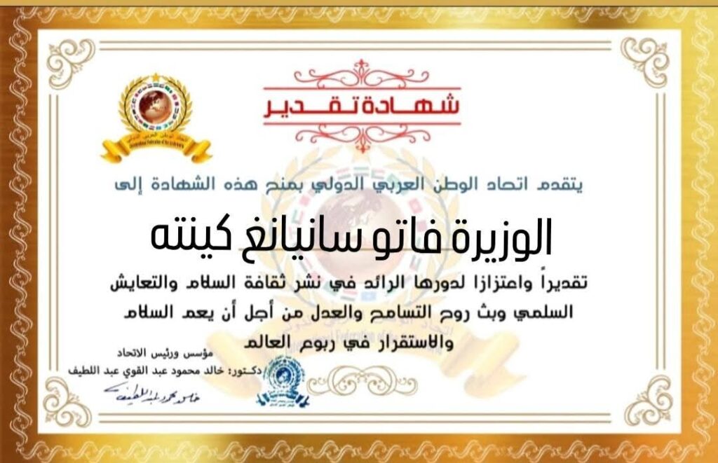 مؤسس ورئيس اتحاد الوطن العربي الدولي يمنح شهادة تقدير للوزيرة فاتو سانيانغ كينته وزيرة شؤون المرأة والطفل والرعاية الإجتماعية بجمهورية جامبياitihadworld06/02/2026تكريمات