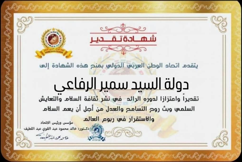مؤسس ورئيس اتحاد الوطن العربي الدولي يمنح شهادة تقدير لدول السيد سمير الرفاعي رئيس الوزراء الأسبق للمملكة الأردنية الهاشميةitihadworld06/02/2026تكريمات