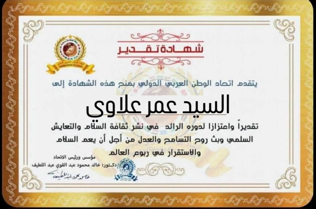 مؤسس ورئيس اتحاد الوطن العربي الدولي يمنح شهادةتقدير للسيد عمر علاوي مدير فندق شهبا حلب بمحافظة حلبitihadworld08/02/2026تكريمات