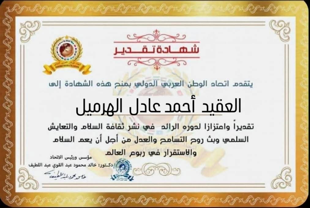 مؤسس ورئيس اتحاد الوطن العربي الدولي يمنح شهادة تقدير للعقيد أحمد عادل الهرميل بمديرية آمن الغربية بوزارة الداخلية