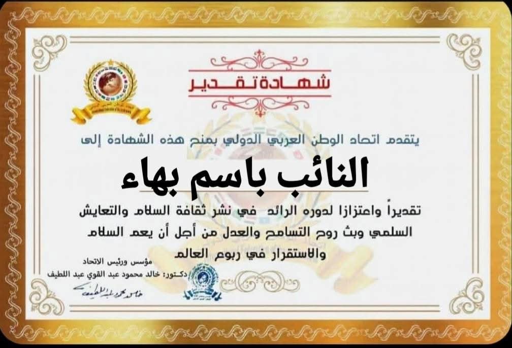 مؤسس ورئيس اتحاد الوطن العربي الدولي يمنح شهادة تقدير للنائب باسم بهاء بلال عبد العزيز لقيه عضو مجلس النواب عن محافظة القليوبية الدائرة الخامسة