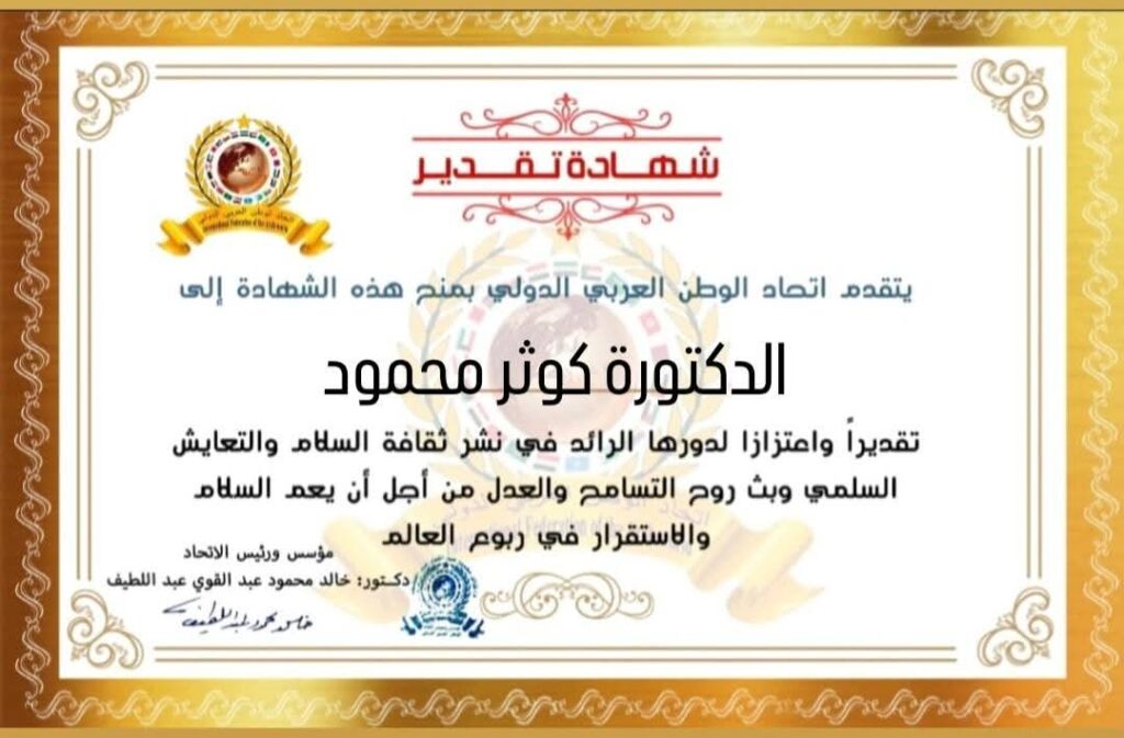 مؤسس ورئيس اتحاد الوطن العربي الدولي يمنح شهادة تقدير للدكتورة كوثر محمود النقيب العام للتمريض المصري بجمهورية مصر العربيةitihadworld11/02/2026تكريمات