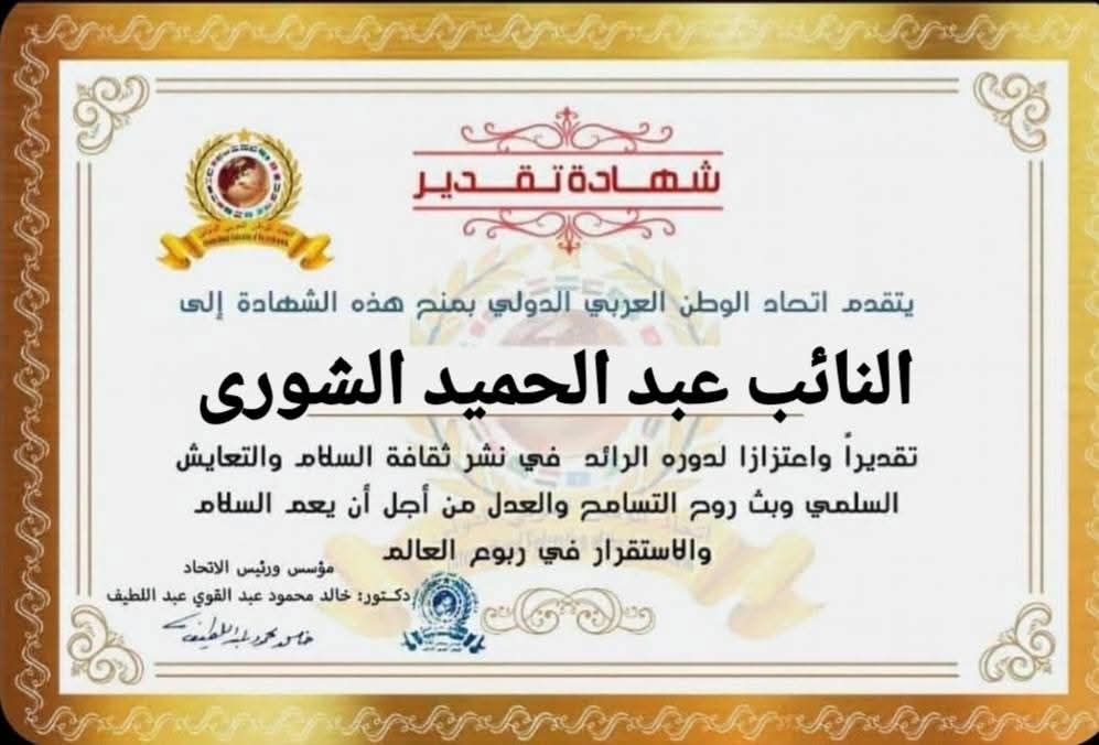 مؤسس ورئيس اتحاد الوطن العربي الدولي يمنح شهادة تقديرللنائب عبد الحميد حب النبي محمد الشورى عضو مجلس النواب عن محافظة القليوبية الدائرة الرابعةitihadworld26/12/2025تكريمات