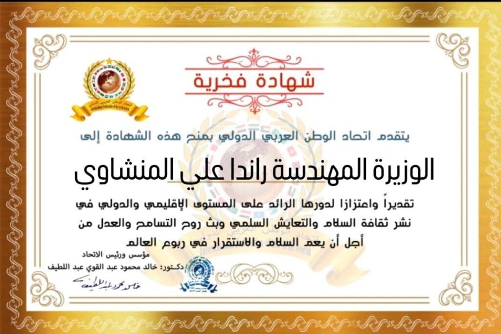 مؤسس ورئيس اتحاد الوطن العربي الدولي يمنح شهادة فخرية للوزيرة المهندسة راندا علي صالح فؤاد المنشاوي وزيرة الإسكان والمرافق والمجتمعات العمرانية في جمهورية مصر العربيةitihadworld12/02/2026تكريمات