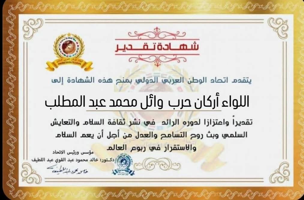 مؤسس ورئيس اتحاد الوطن العربي الدولي يمنح شهادة تقدير للواء أركان حرب وائل محمد عبد المطلب مدير إدارة التعينات بالقوات المسلحة المصريةitihadworld14/02/2026تكريمات