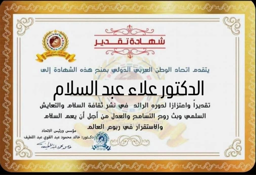 مؤسس ورئيس اتحاد الوطن العربي الدولي يمنح شهادة تقدير للدكتور علاء عبد السلام رئيس دار الأوبرا المصريةitihadworld15/02/2026تكريمات
