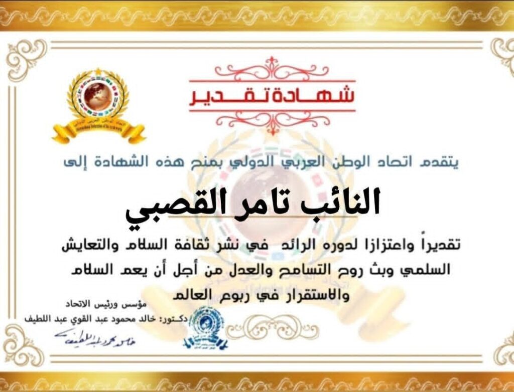 مؤسس ورئيس اتحاد الوطن العربي الدولي يمنح شهادة تقدير للنائب تامر أحمد ماهر مصطفى محمد القصبي عضو مجلس النواب عن محافظة الدقهلية الدائرة الثانيةitihadworld26/12/2025تكريمات