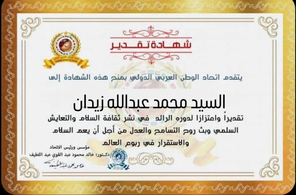 مؤسس ورئيس اتحاد الوطن العربي الدولي الدولي شهادة تقدير للسيد محمد عبدالله محمد علام زيدان نائب محافظ السويس بجمهورية مصر العربيةitihadworld18/02/2026تكريمات