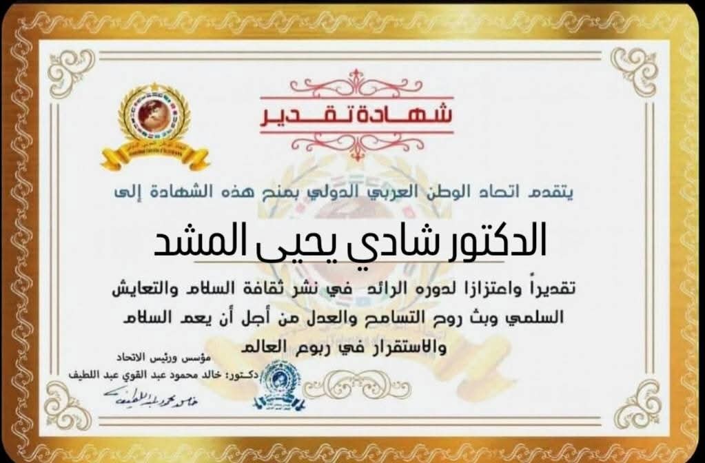 مؤسس ورئيس اتحاد الوطن العربي الدولي يمنح شهادة تقدير للدكتور شادي يحيى عبد العظيم المشد نائب محافظ البحيرة بجمهورية مصر العربيةitihadworld18/02/2026تكريمات