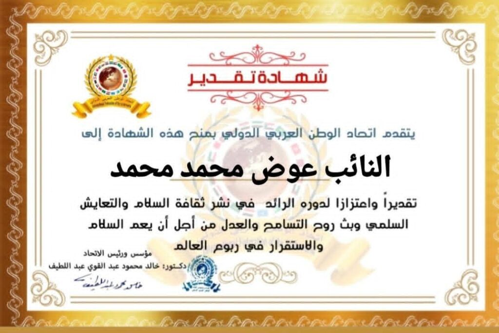 مؤسس ورئيس اتحاد الوطن العربي الدولي يمنح شهادة تقديرللنائب عوض محمد عبد الفتاح محمد عضو مجلس النواب عن محافظة الدقهلية الدائرة الثالثةitihadworld26/12/2025تكريمات