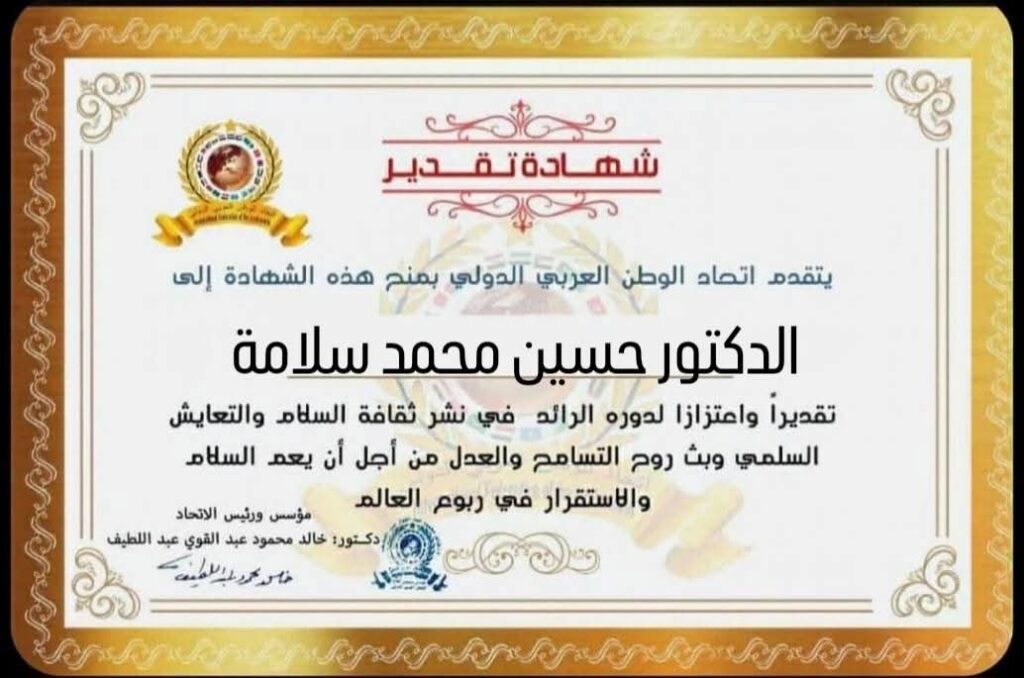 مؤسس ورئيس اتحاد الوطن العربي الدولي يمنح شهادة تقدير للدكتور حسين محمد مغربي سلامة نائب محافظ الدقهلية بجمهورية مصر العربيةitihadworld18/02/2026تكريمات
