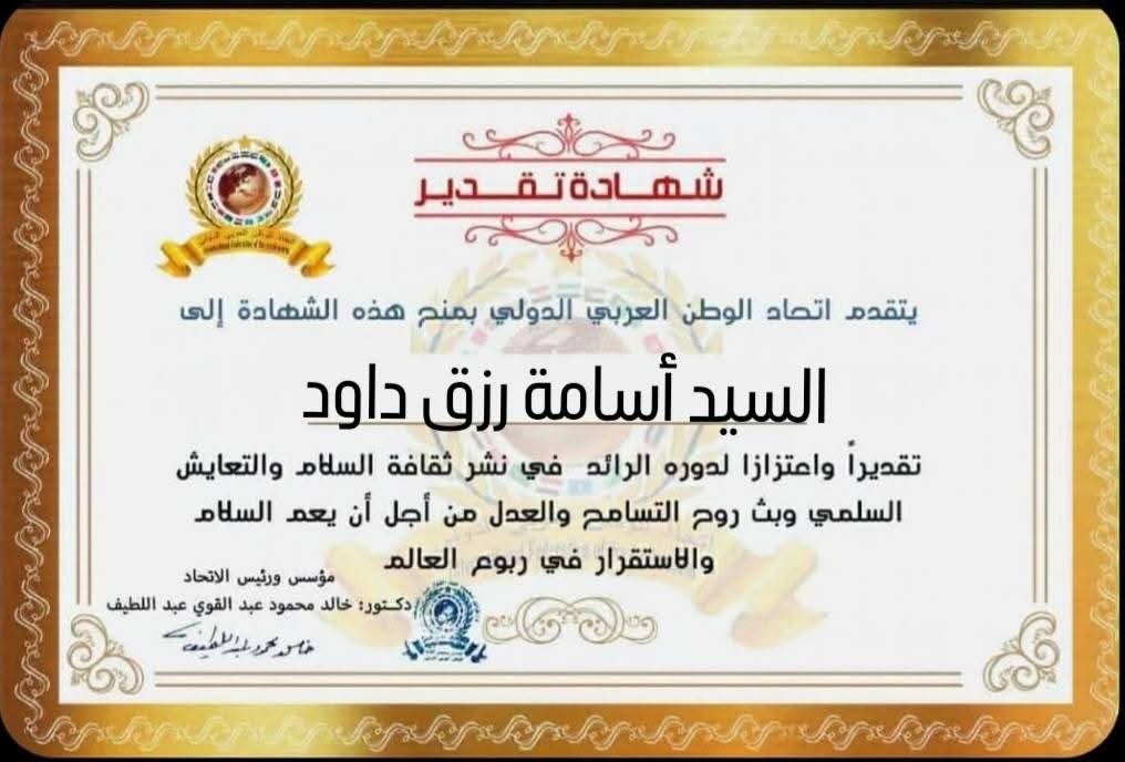 مؤسس ورئيس اتحاد الوطن العربي الدولي يمنح شهادة تقدير للسيد أسامة رزق محمد منصور داود نائب محافظ أسوان بجمهورية مصر العربيةitihadworld18/02/2026تكريمات