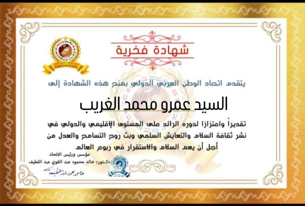 مؤسس ورئيس اتحاد الوطن العربي الدولي يمنح شهادة فخرية للسيد عمرو محمد السيد الغريب محافظ المنوفية بجمهورية مصر العربيةitihadworld18/02/2026تكريمات