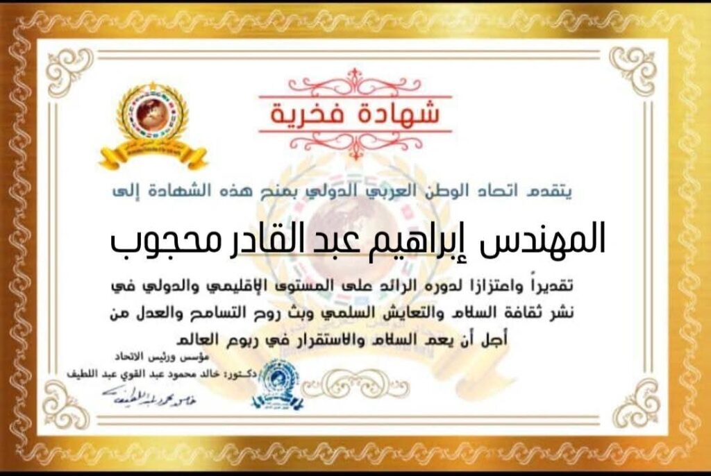 مؤسس ورئيس اتحاد الوطن العربي الدولي يمنح شهادة فخرية للسيد المهندس إبراهيم عبد القادر مكي محجوب محافظ كفر الشيخ بجمهورية مصر العربية