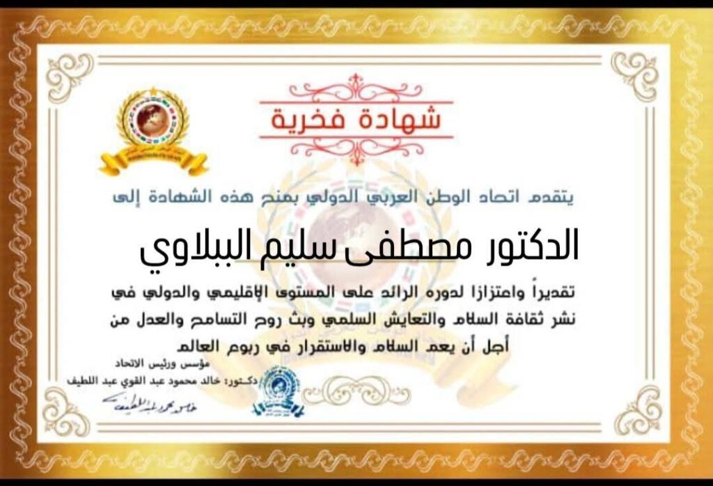 مؤسس ورئيس اتحاد الوطن العربي الدولي يمنح شهادة فخرية للسيد الدكتور مصطفى سليم أمين عبد الظاهر الببلاوي محافظ قنا بجمهورية مصر العربيةitihadworld18/02/2026تكريمات