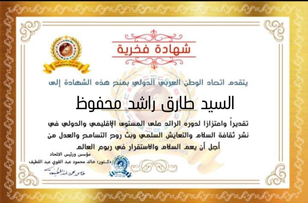 مؤسس ورئيس اتحاد الوطن العربي الدولي يمنح شهادة فخرية للسيد طارق راشد محمد محفوظ محافظ سوهاج بجمهورية مصر العربيةitihadworld18/02/2026تكريمات