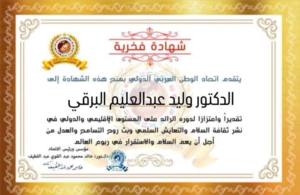مؤسس ورئيس اتحاد الوطن العربي الدولي يمنح شهادة فخرية للسيد الدكتور وليد عبد العليم إبراهيم البرقي محافظ البحر الأحمر بجمهورية مصر العربيةitihadworld18/02/2026تكريمات