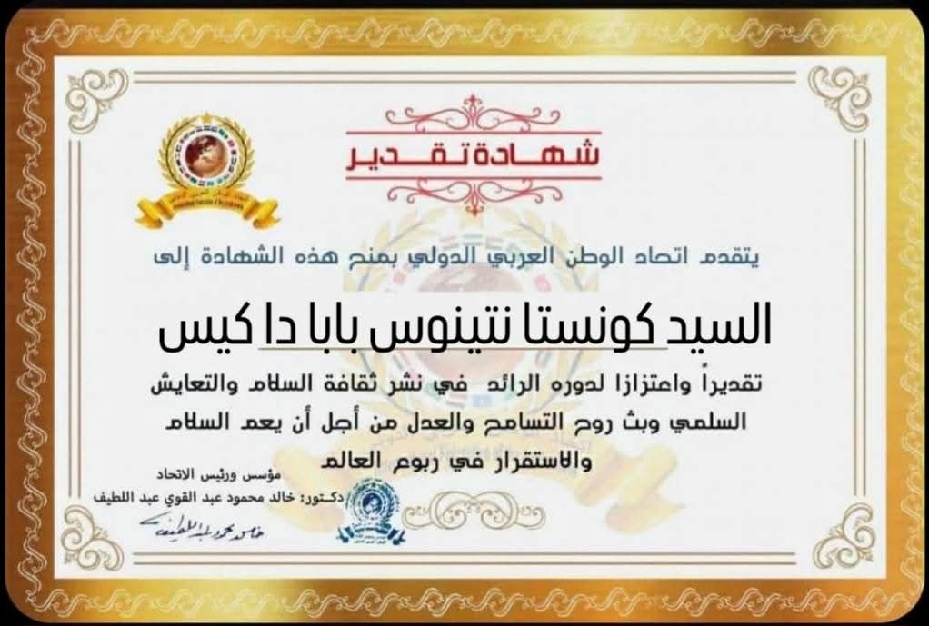 مؤسس ورئيس اتحاد الوطن العربي الدولي يمنح شهادة تقدير للسيد كوستا نتينوس بابا داكيس مبعوث المدير العام لمنظمة العمل الدولية