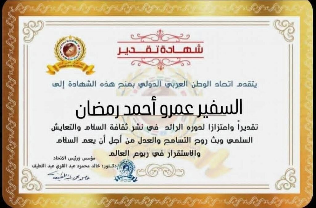 مؤسس ورئيس اتحاد الوطن العربي الدولي يمنح شهادة تقدير للسفير عمرو أحمد رمضان رئيس اللجنة الوطنية التنسيقية لمكافحة ومنع الهجرة غير الشرعية والاتجار بالبشر بجمهورية مصر العربيةitihadworld24/02/2026تكريمات