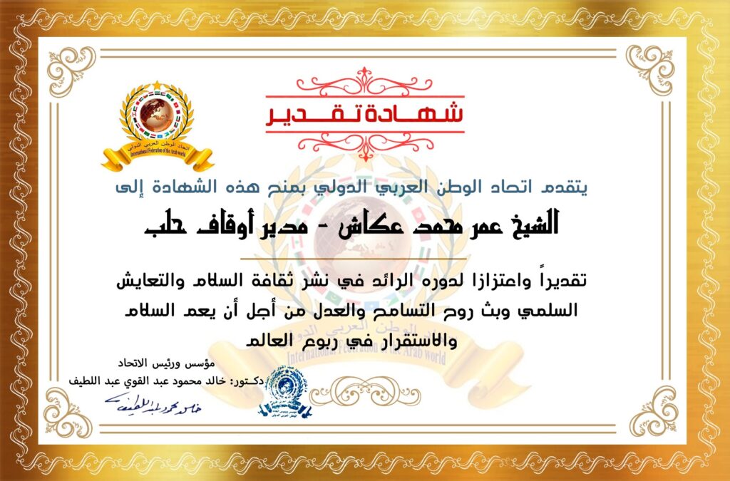 مؤسس ورئيس اتحاد الوطن العربي الدولي الدكتور خالد محمود عبد القوي عبد اللطيف يمنح شهادة تقدير للشيخ عمر محمد عكاش مدير الأوقاف بمحافظة حلبitihadworld26/02/2026تكريمات