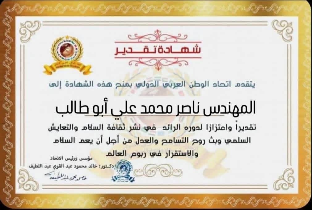 مؤسس ورئيس اتحاد الوطن العربي الدولي يمنح شهادة تقدير للمهندس الزراعي ناصر محمد محمود علي ابو طالب وكيل وزارة الزراعة واستصلاح الأراضي بمحافظة البحيرة بجمهورية مصر العربية