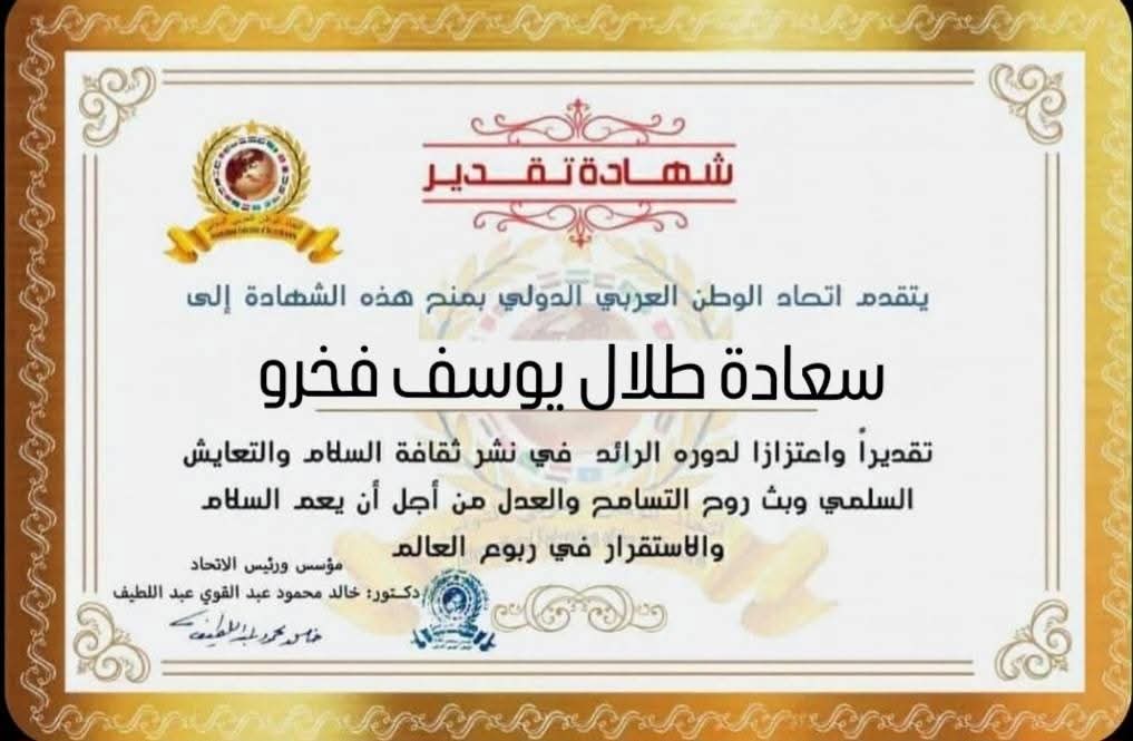 مؤسس ورئيس اتحاد الوطن العربي الدولي يمنح شهادة تقدير لسعادة طلال يوسف فخرو القنصل العام لمملكة البحرين في دبي بدولة الامارات العربية المتحدةitihadworld25/02/2026تكريمات