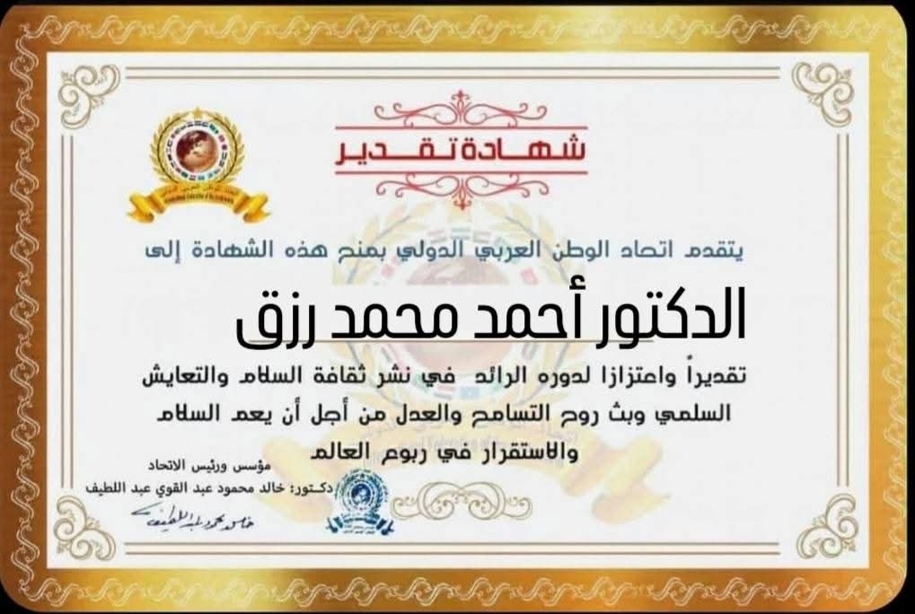 مؤسس ورئيس اتحاد الوطن العربي الدولي يمنح شهادة تقدير للدكتور أحمد محمد رزق رئيس قطاع الخدمات الزراعية بوزارة الزراعة واستصلاح الأراضي بجمهورية مصر العربيةitihadworld25/02/2026تكريمات