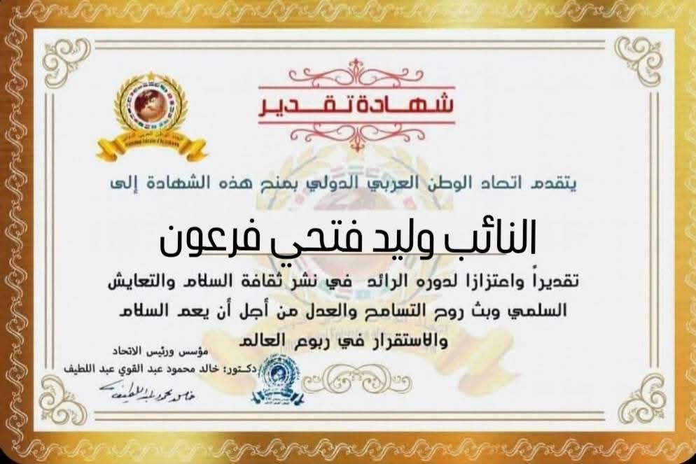 مؤسس ورئيس اتحاد الوطن العربي الدولي يمنح شهادة تقدير للنائب وليد فتحي فرعون رئيس مجلس إدارة جمعية مستثمري جمصة بالمنطقة الصناعية من جمهورية مصر العربية
