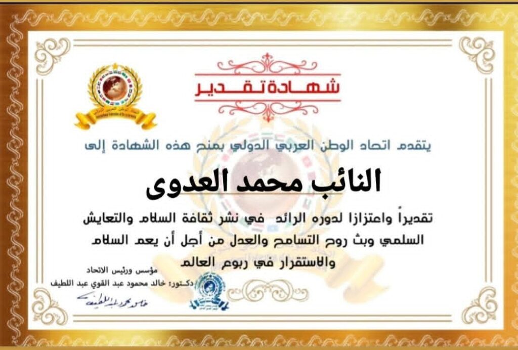مؤسس ورئيس اتحاد الوطن العربي الدولي يمنح شهادة تقديرللنائب محمد عبد الغني زكي مصطفى العدوى عضو مجلس النواب عن محافظة المنوفية الدائرة الثانية