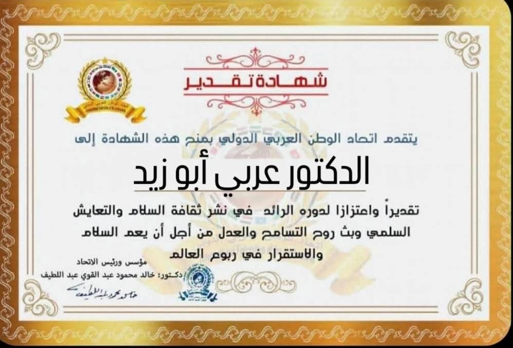 مؤسس ورئيس اتحاد الوطن العربي الدولي يمنح شهادة تقدير للدكتور عربي أبو زيد وكيل مديرية التربية والتعليم بمحافظة الإسكندرية بجمهورية مصر العربيةitihadworld26/02/2026تكريمات